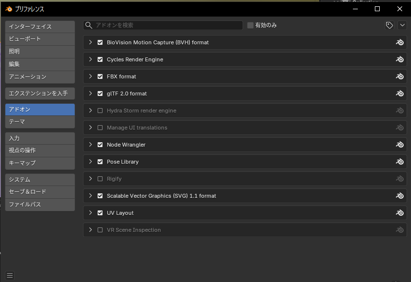 編集→プリファレンス→アドオンで「node」と検索すると「Node Wrangler」が出てきますので、チェックを入れます。