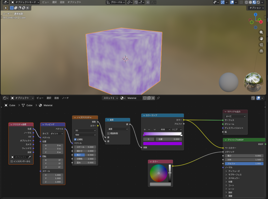 ノイズテクスチャを入れて、解説されている通りに設定していくと、先生と同じ感じになっていきます。