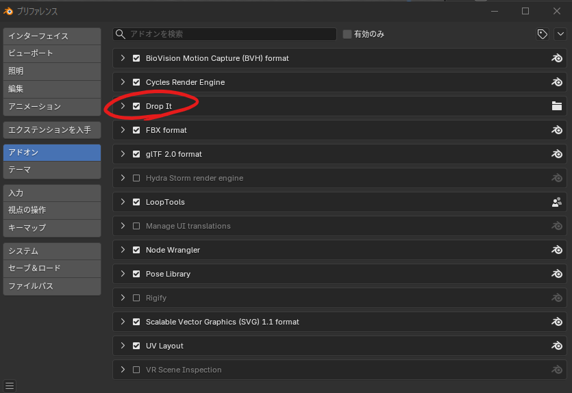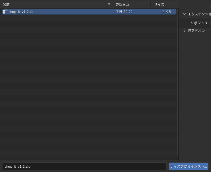 zipファイルの置き先はどこでも良いです(私はblender用のファイルの中にアドオンフォルダを作ってそこに入れてます)