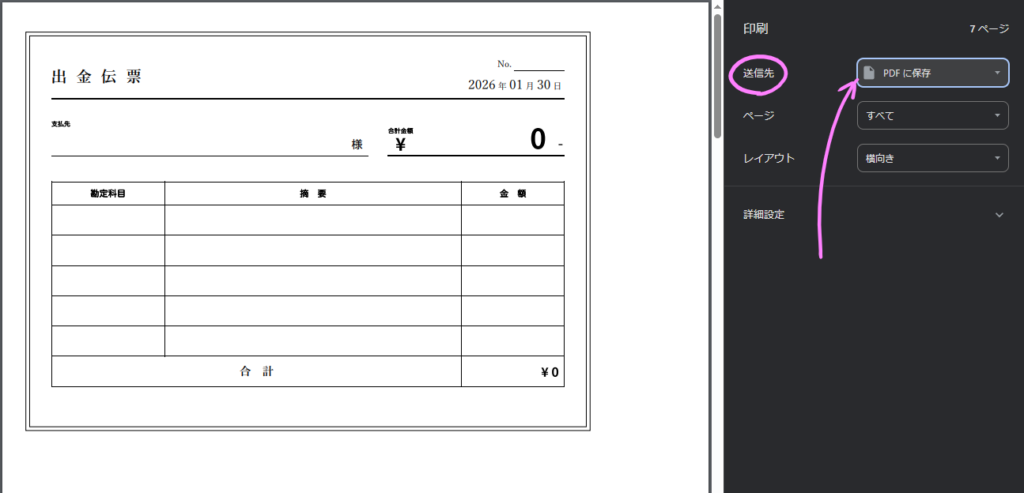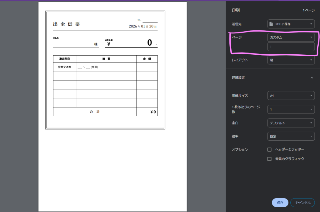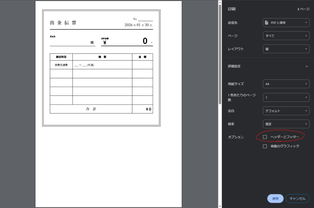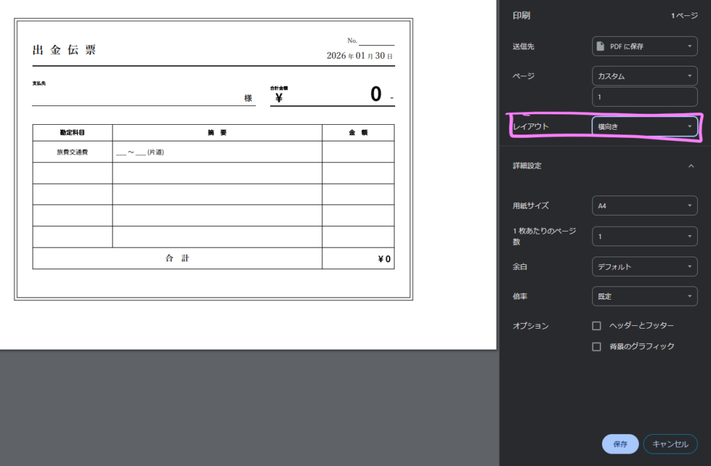 このボタンから印刷画面を開くと出金伝票のエリアを切り取って印刷プレビューを作成します。