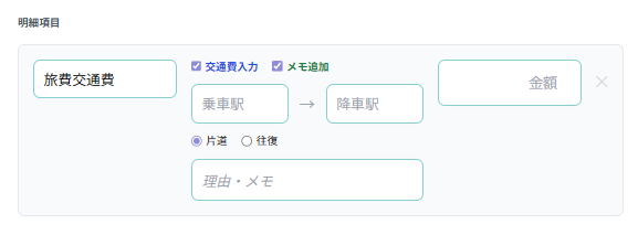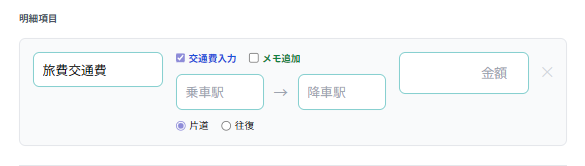 交通費は交通費にチェックを入れると「乗車駅・降車駅」「片道/往復」の入力欄が出現します。