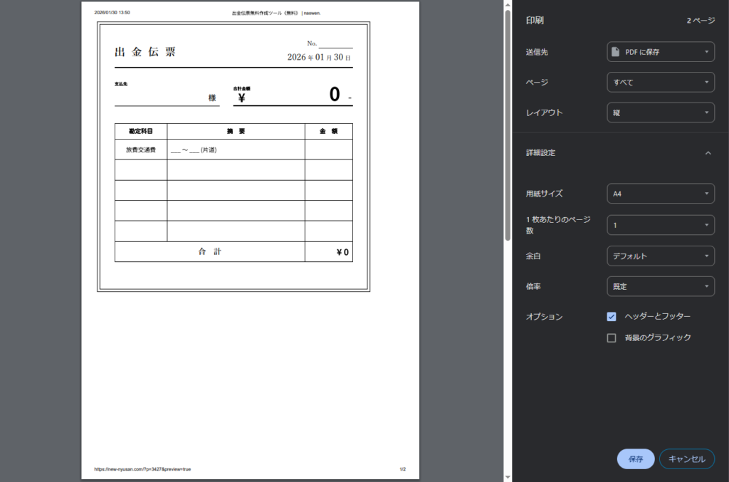 「印刷/PDF保存」ボタンを押すとプレビューが開きます。ブラウザの仕様上、少し調整が必要な場合があります。